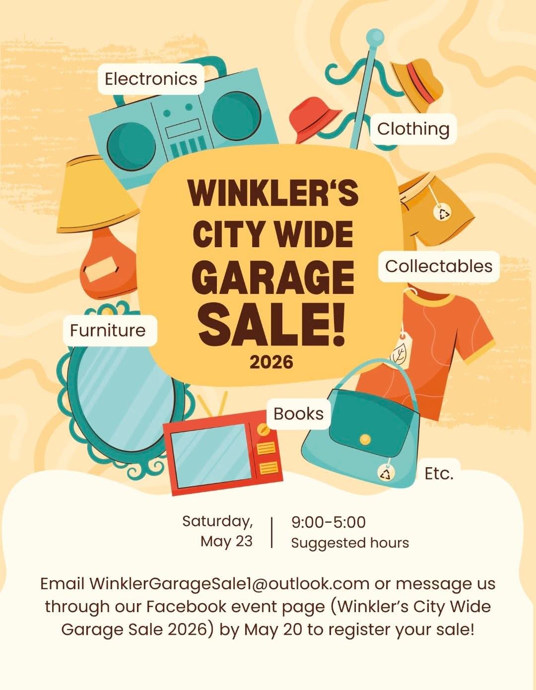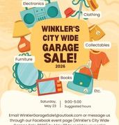 Join us for a day of garagesaleing in Winkler on Saturday, May 23 from 9:00am-5:00pm! A map of all registered sales will be posted on our Facebook event page (Winkler's City Wide Garage Sale 2026) on May 22, so have a sale or come to shop!